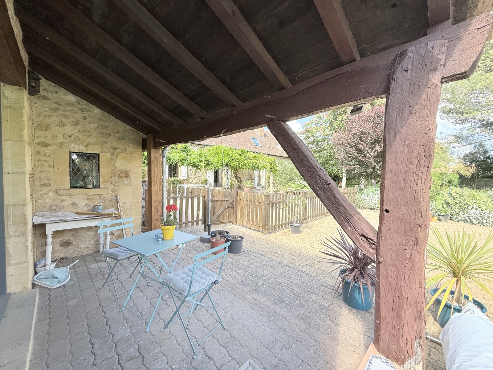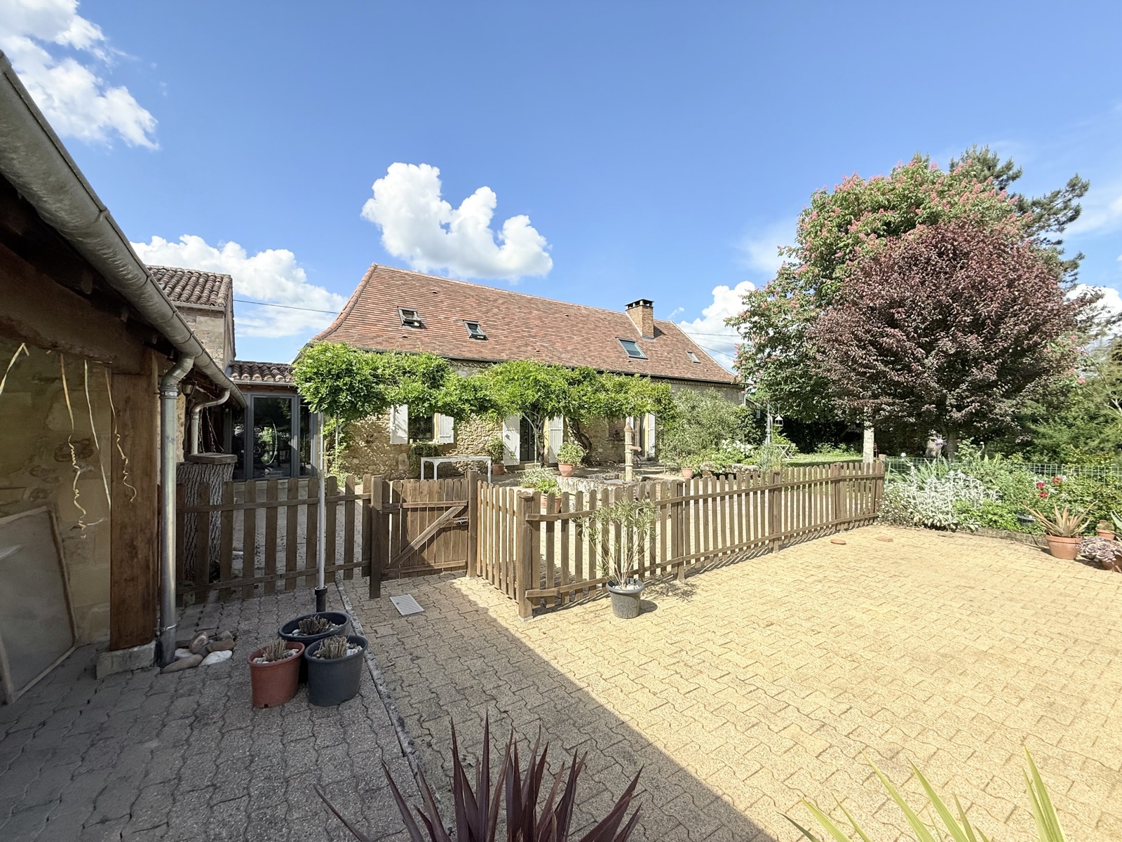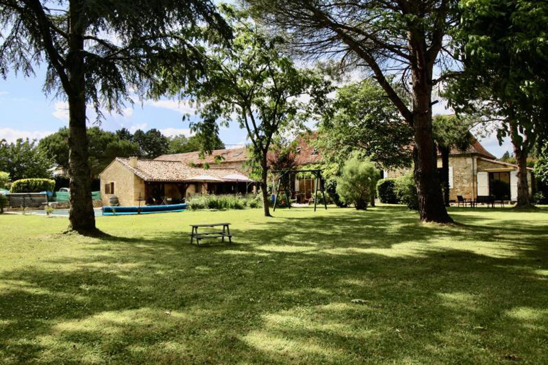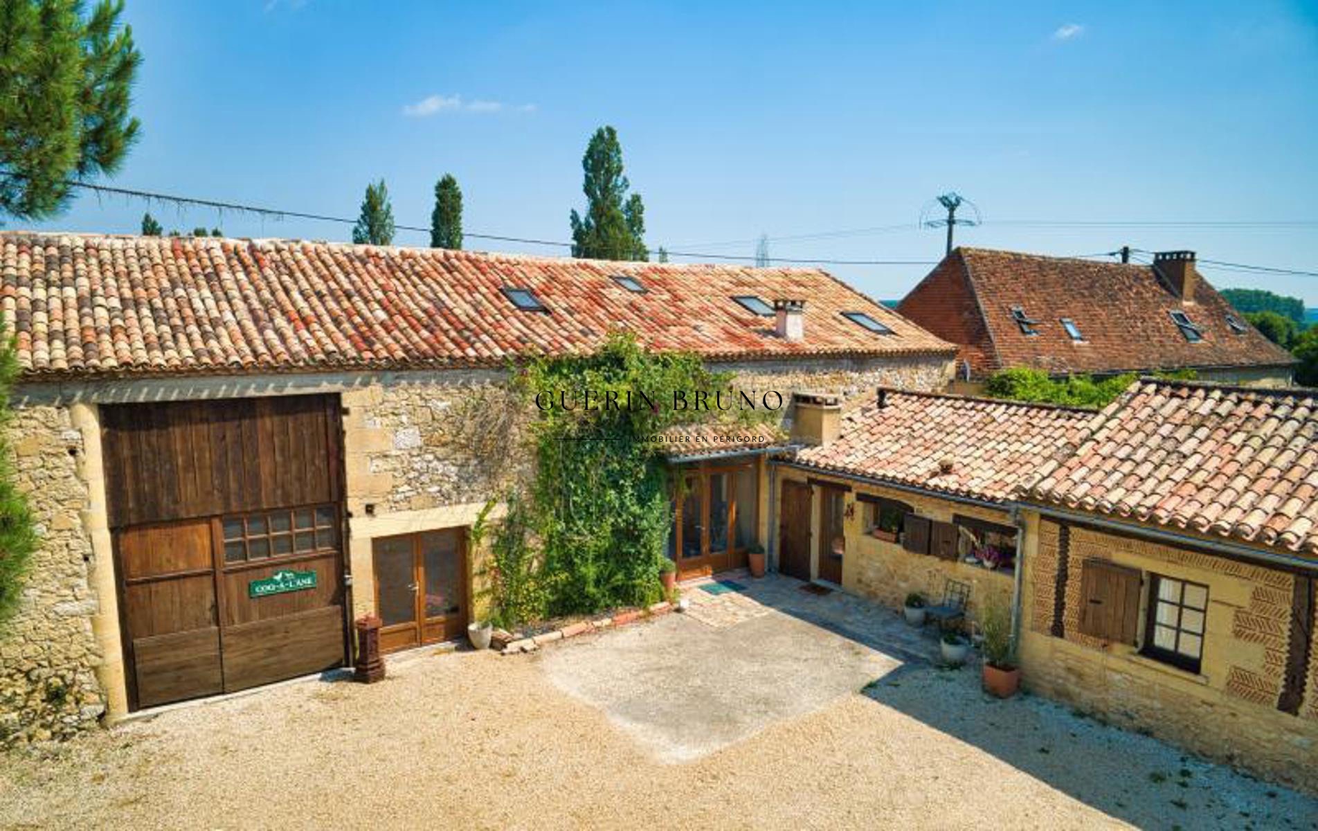 L'ensemble immobilier se compose de trois bâtiments en pierre de construction traditionnelle, chacun avec des toitures distinctes, les habitations étant couvertes de tuiles plates du Périgord à quatre pans, et les autres bâtiments avec des tuiles canal à deux pans. Les ouvertures bien orientées vers le Sud offrent une vue imprenable sur l'espace détente comprenant la piscine et le jardin verdoyant.