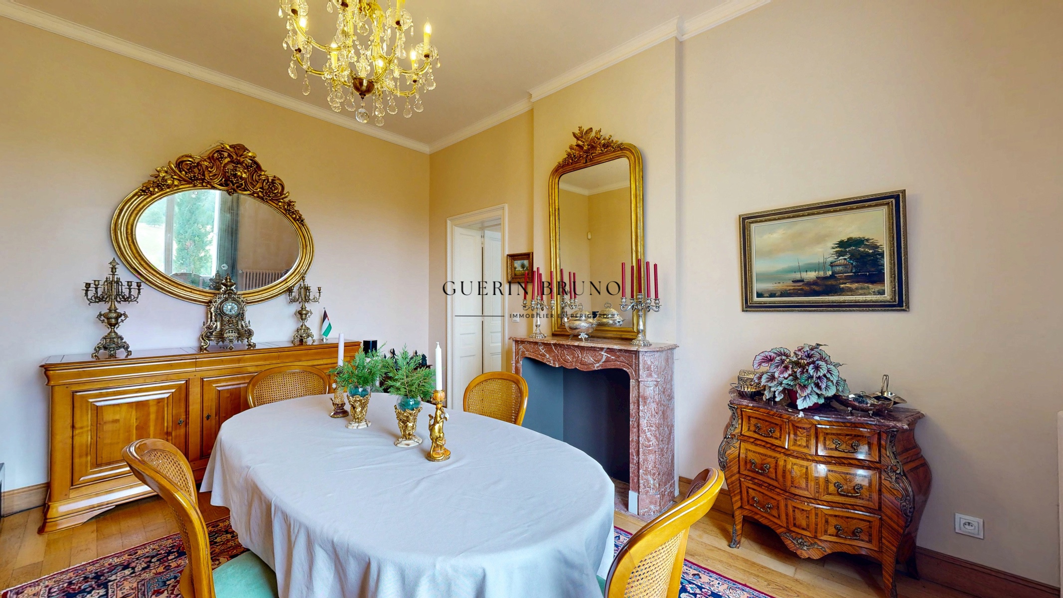 Rez-de-chaussée : entrée en travertin avec moulures et rosace, hauteur sous plafond 3,30 m. À gauche, un salon double exposé sud et ouest, parquet et moulures. À droite, une salle à manger avec cheminée décorative, attenante à une cuisine équipée récente ouvrant sur la terrasse. Buanderie, WC invités, cellier, et garage/atelier complètent ce niveau.